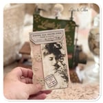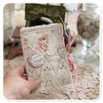 I have used some of the prettiest floral fabric along with a pretty green blue floral fabric for this needle book along with some patches of pink gingham. also finished with some vintage French lace and a mother of pearl button. I have also pinned a vintage French motive to the front
