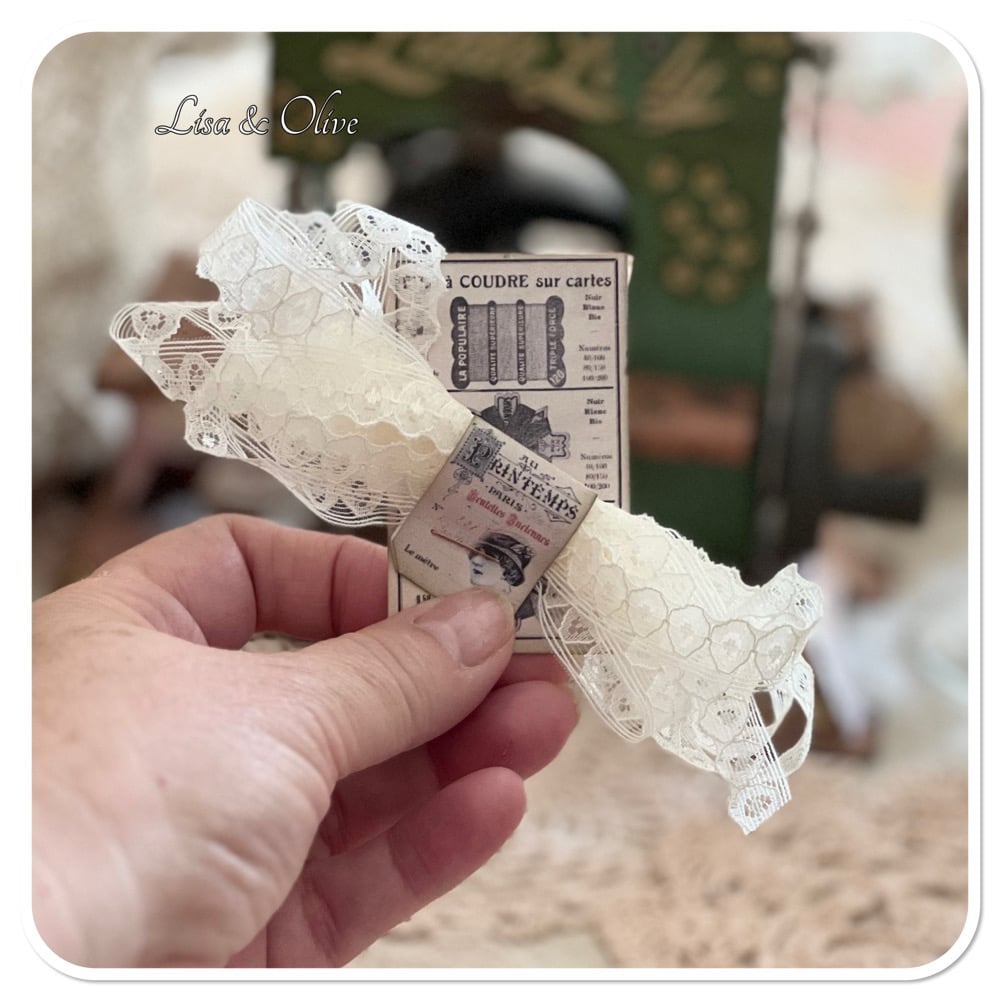 when you open the needle book/ sewing book on the left is a lace pocket with 6 different lace snippet on 6 different lace sample cards. on the other side is 2 metre of vintage lace along with a few pearl style pins and some pear shaped pins