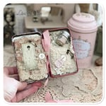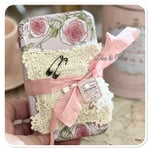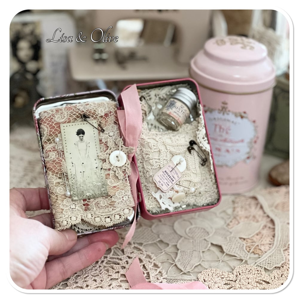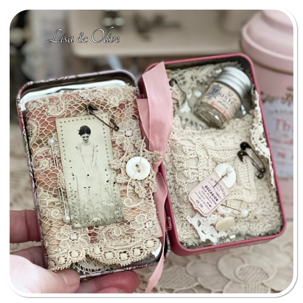 I have added a tiny needle book with a pocket and a handmade tattered pin cushion, also included is a tiny bottle of vintage French mother of pearl buttons and a couple of lace samples 1 sitting in the pocket of the needle book and the other two sit on the Botton of the tin and the lid of the tin. This is a new biscuit tin purchase in Paris last year.