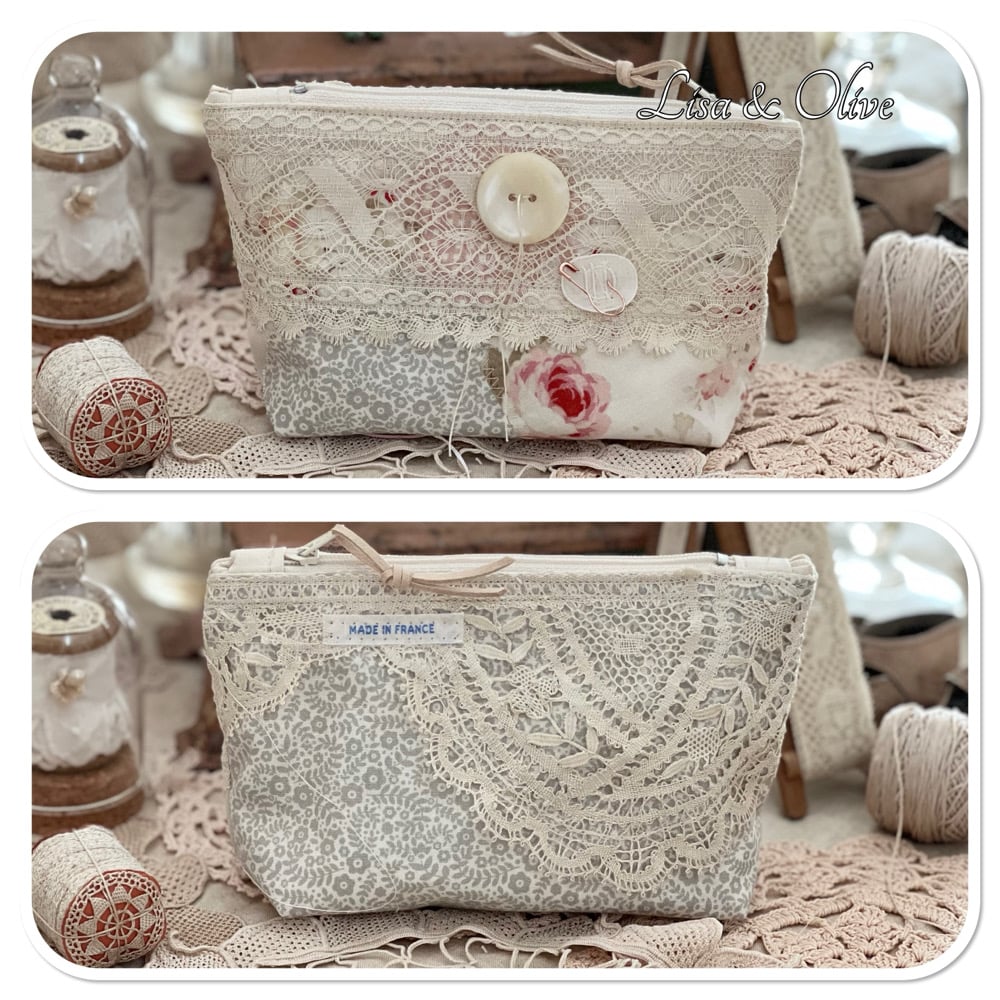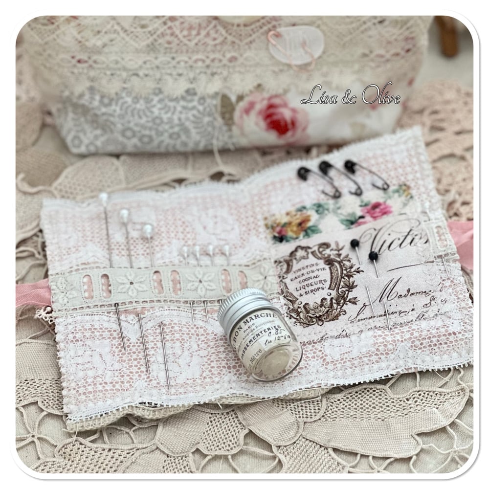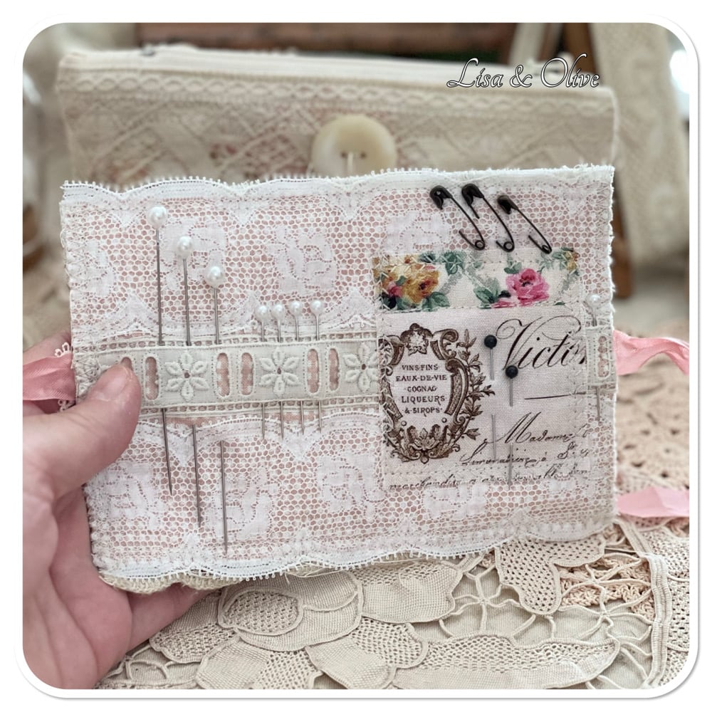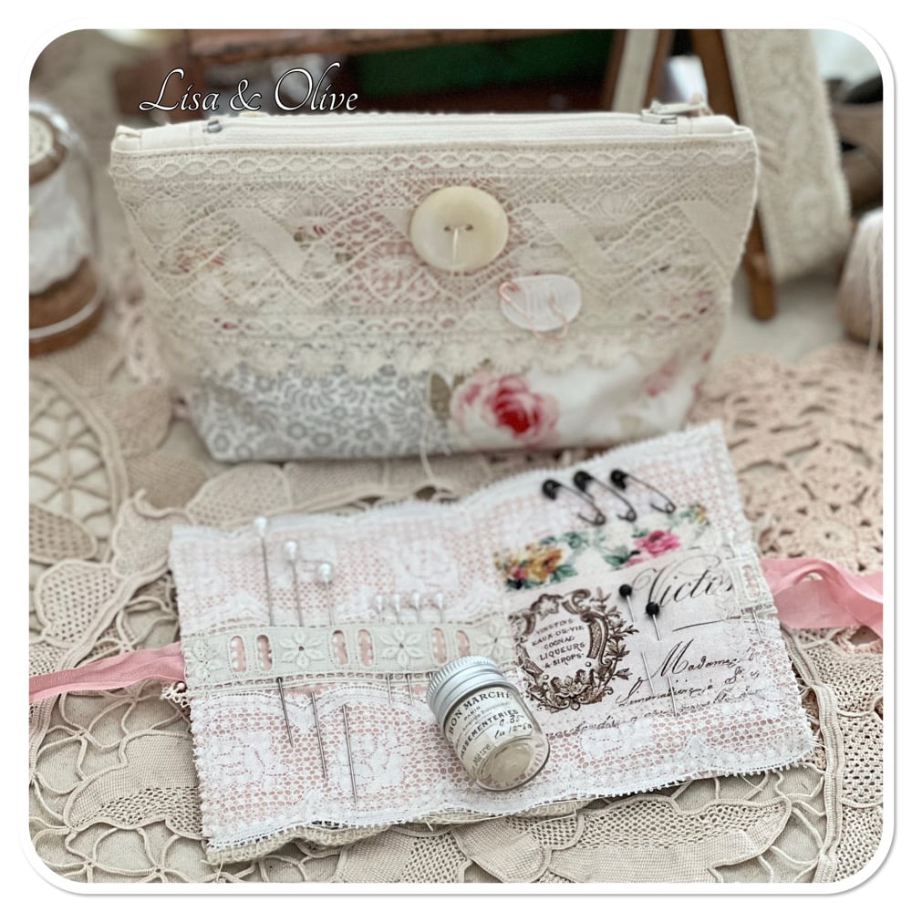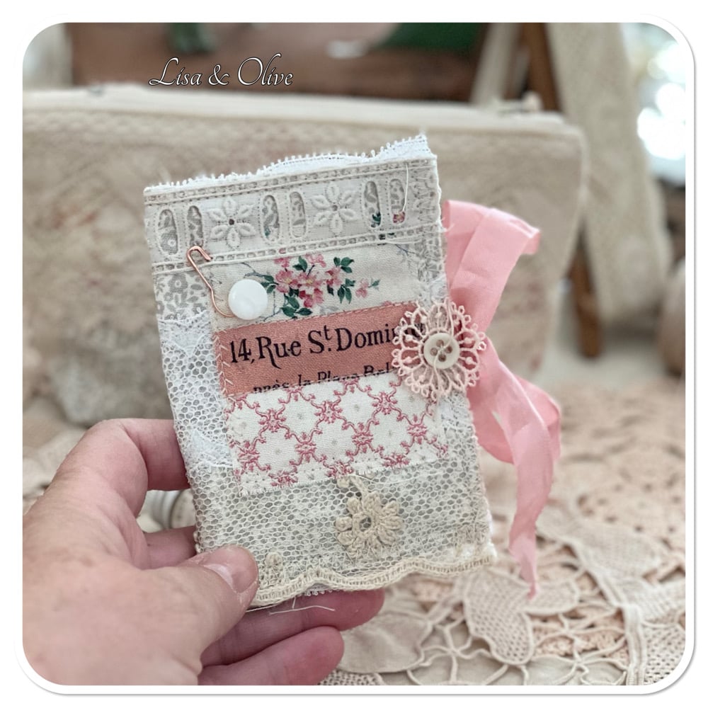 The base of this needle book is hand dyed calico and some pretty floral fabric. the inside and outside of have trimmed with vintage French lace. on the back of the zipper purse is some really lovely vintage French lace and the words made in France ribbon which I purchased a few year ago from the flea markets