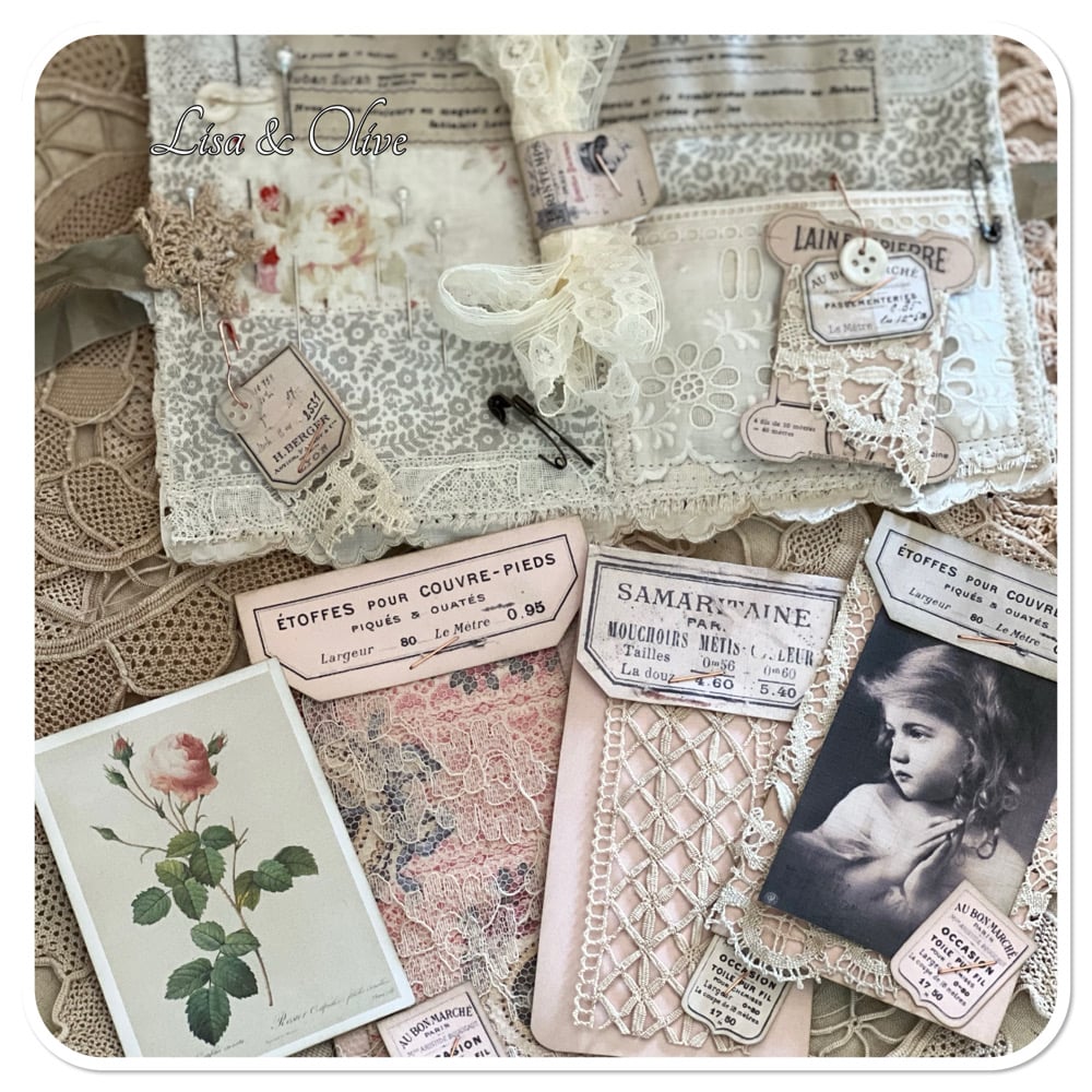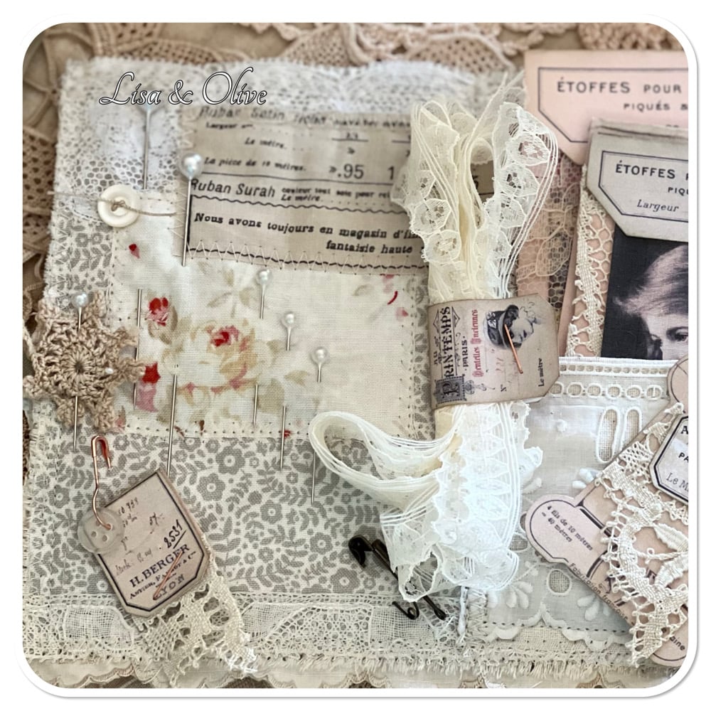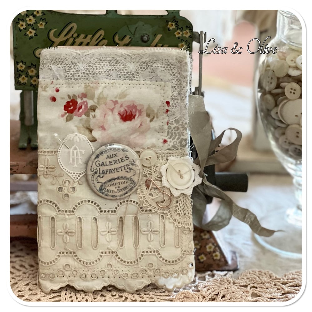 French shabby Chic tattered Sewing Book/Needle book with lace samples