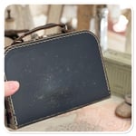 I found this at the Paris flea markets a few years ago and has been in my sewing collection since then. I have loved it and now it's time to pass it onto its next owner. at some stage in its life something has been spilt on it. the little latch works well and the box is in fair vintage condition. The little suitcase is made from cardboard and is a deep navy blue colour, the linning is in fair condition and is a light blue colour there are a few little marks and a tiny bit of water damage at some stage through its life.