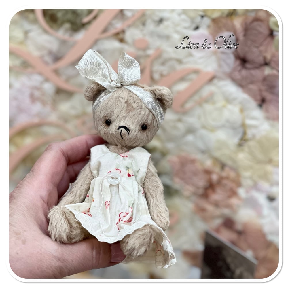 this listing is for a sweet handmade teddy bear wearing a pretty floral dress size of box 12cm sitting and standing 16 cm