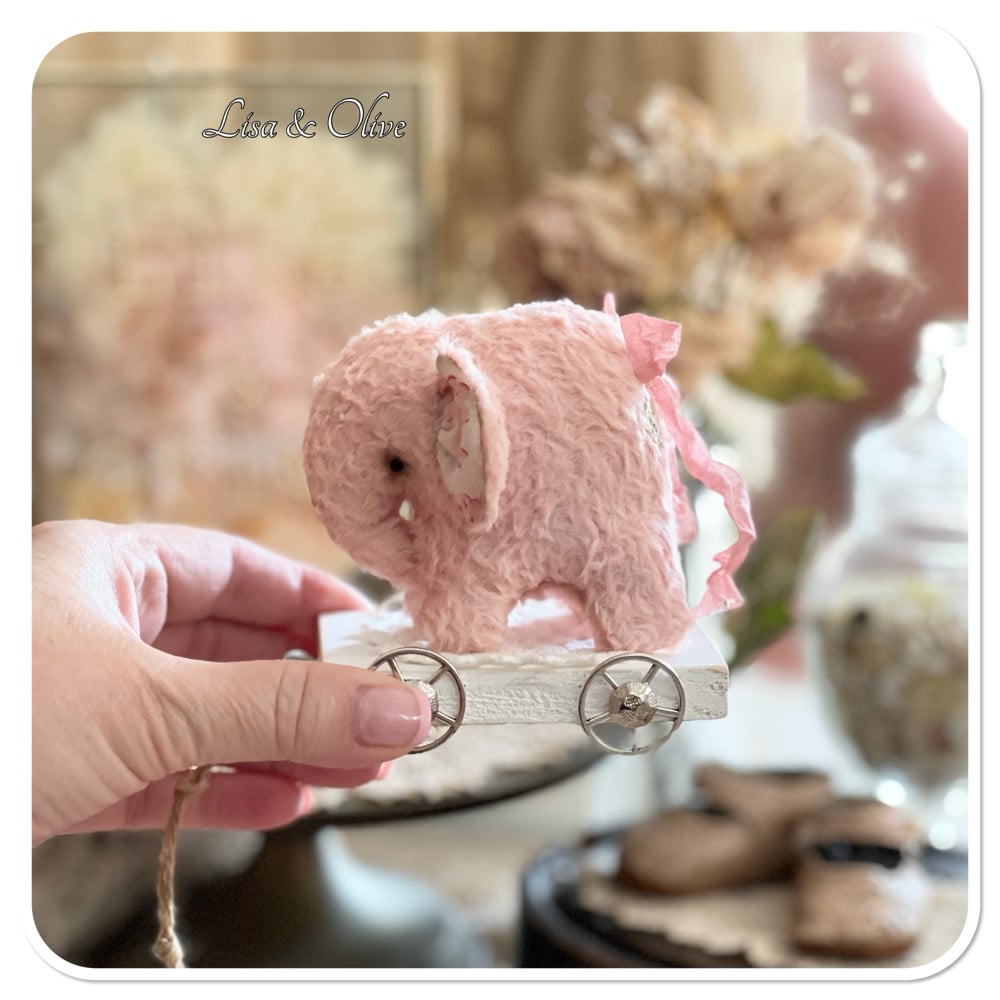 this listing is for a sweet little standing elephant on a little handmade whimsical wooden cart.