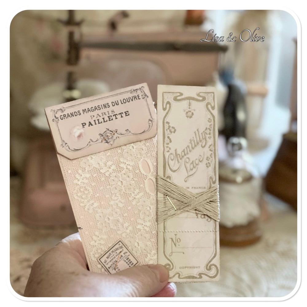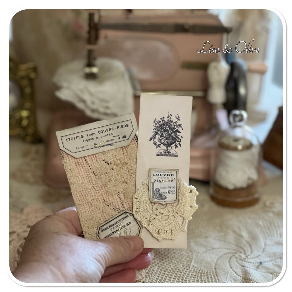 when you open the book there are two pockets inside filled with vintage French lace samples. Sewn into the fabric sewing book is a needle book