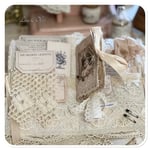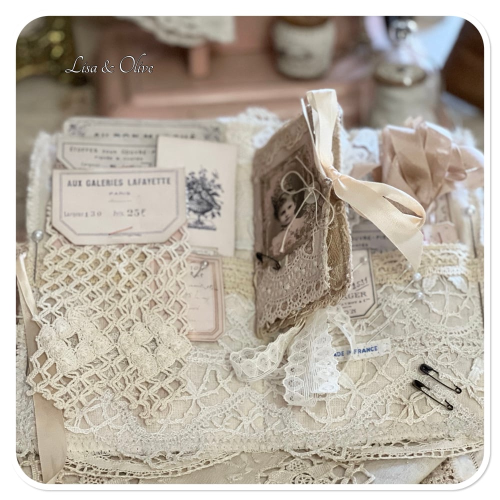 the base of the book is made from hand dyed calico I added some beautiful vintage French lace to the front along with the sweetest image, That sits in a lace pocket on the front cover.
