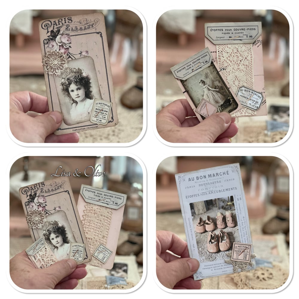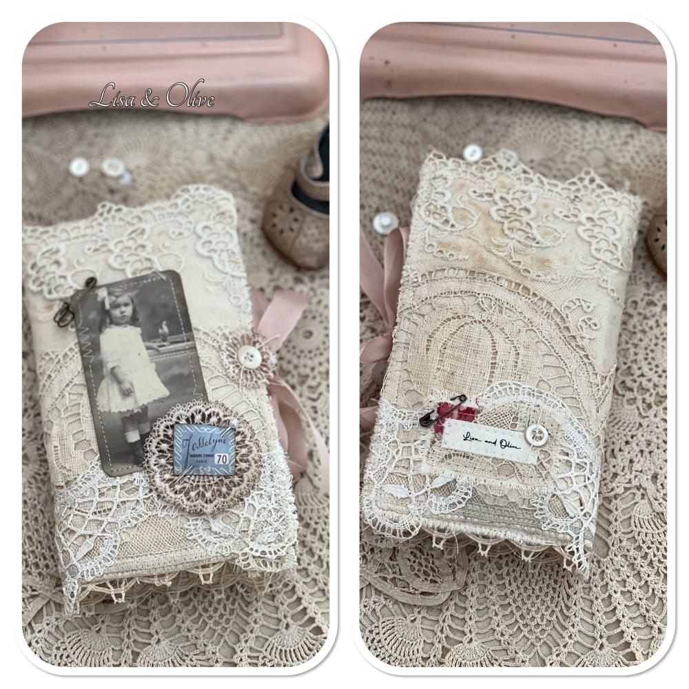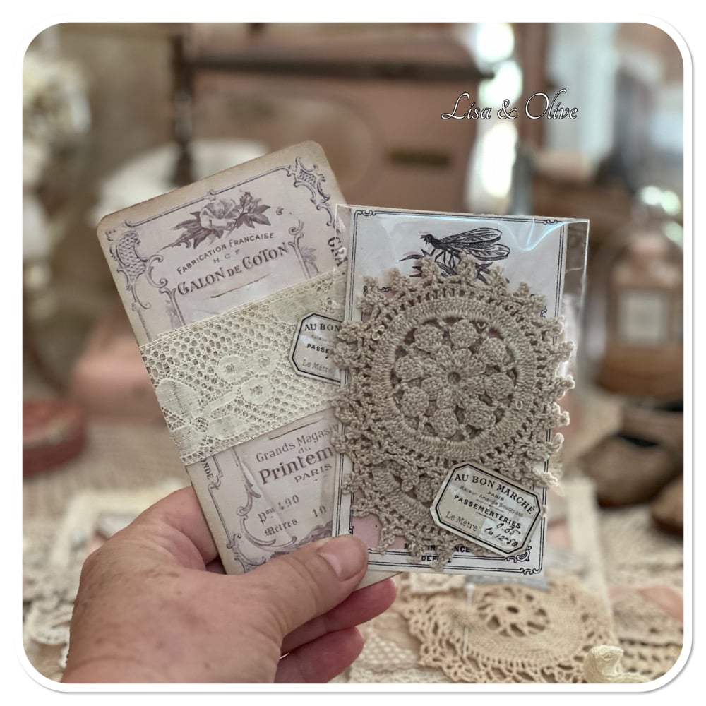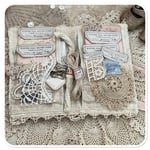 inside the folder are 4 pockets. inside each pocket you will find lace samples and supplies to use in your junk journals.