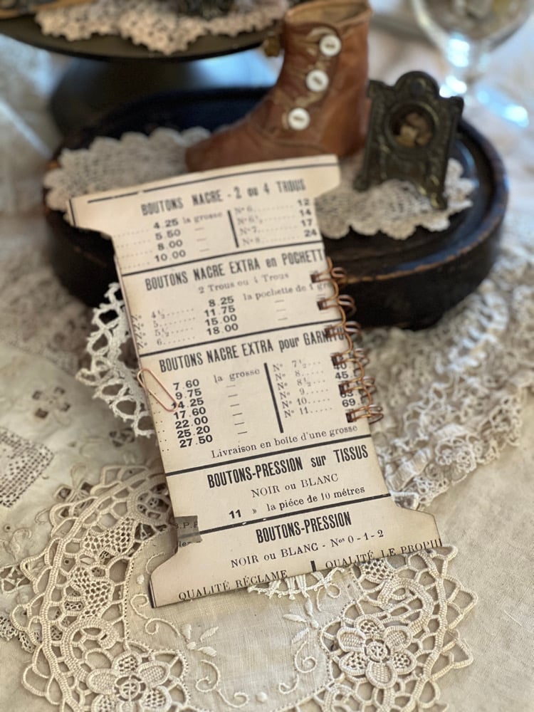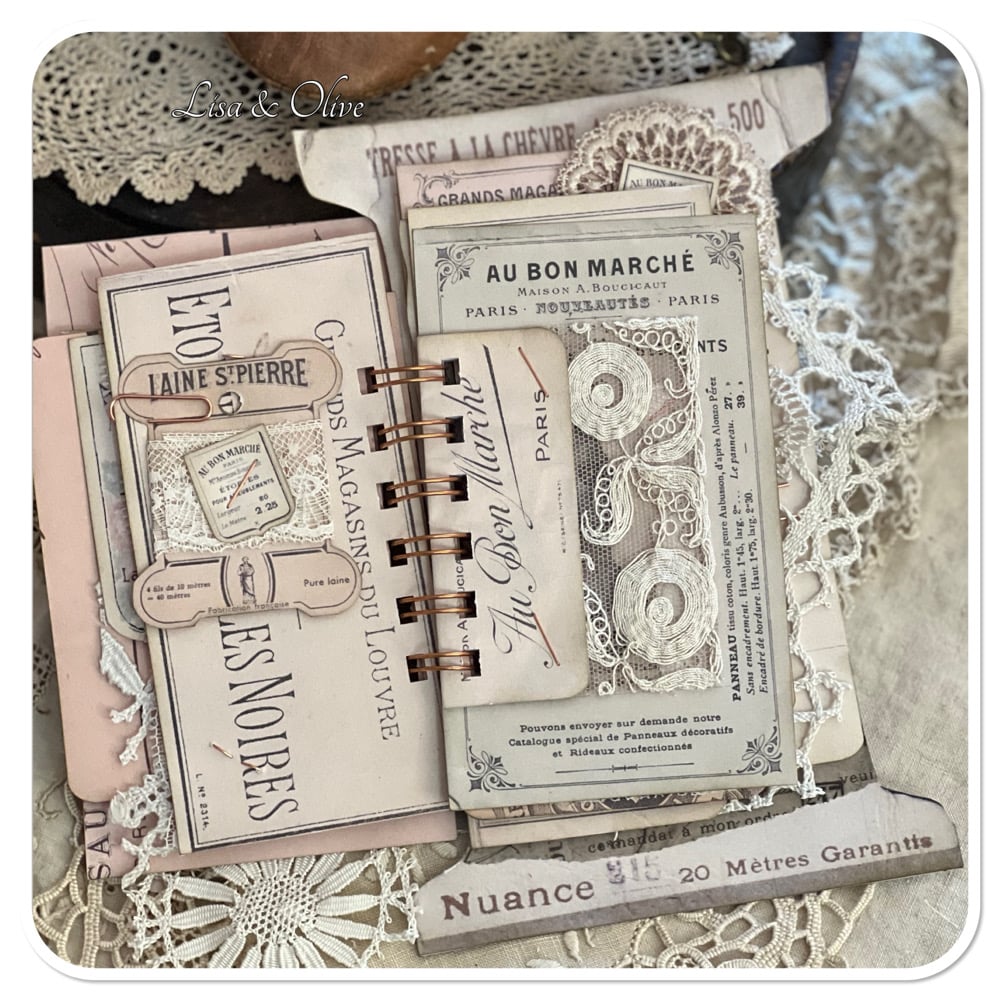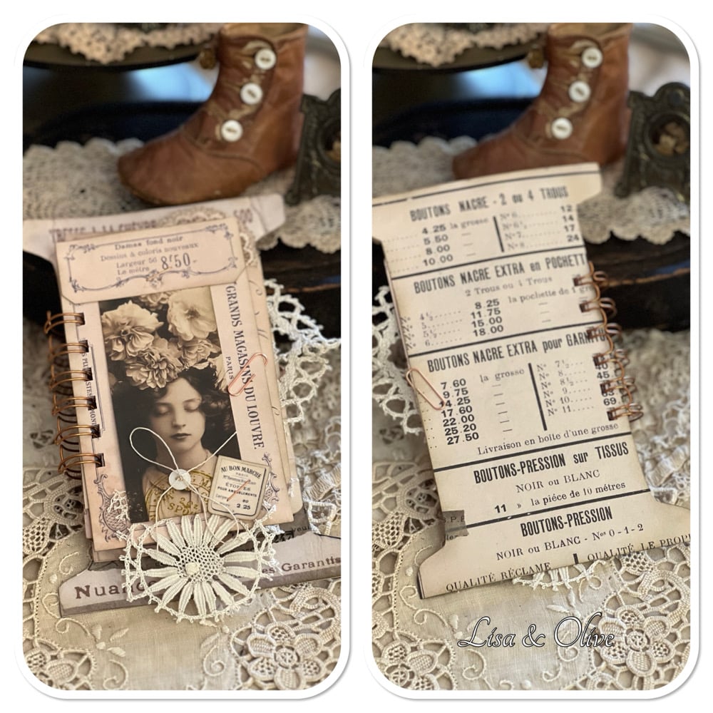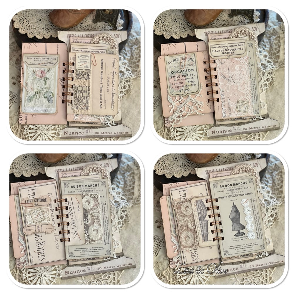 Todays listing is a vintage style French altered tag spool booklet when it opens there are vintage French lace samples