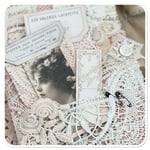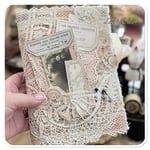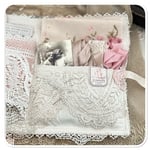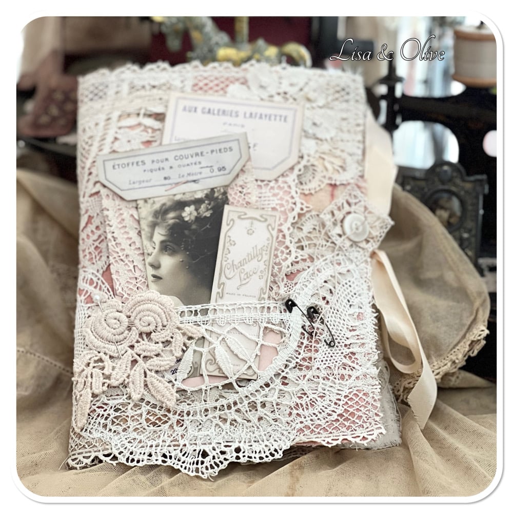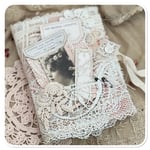 the base of the book is made from hand dyed calico I added some beautiful vintage French lace to the front along with the sweetest image which can be removed from the lace pocket.