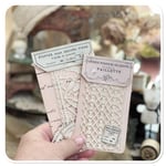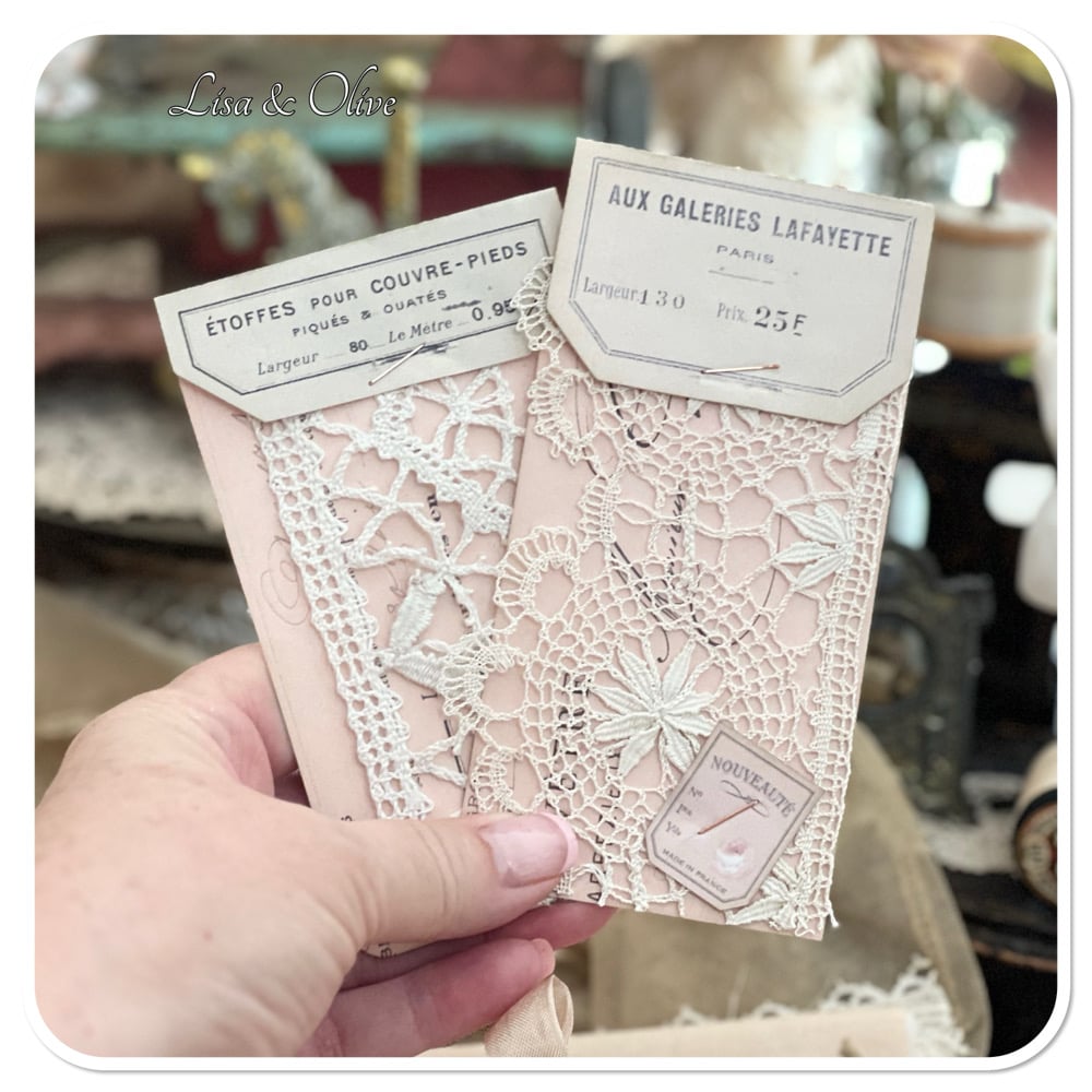 front lace pocket are two vintage French lace sample one of the samples has a photo image.