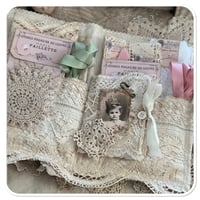 the base of the book is made from hand dyed calico I added some beautiful vintage French lace to the front along with the sweetest image