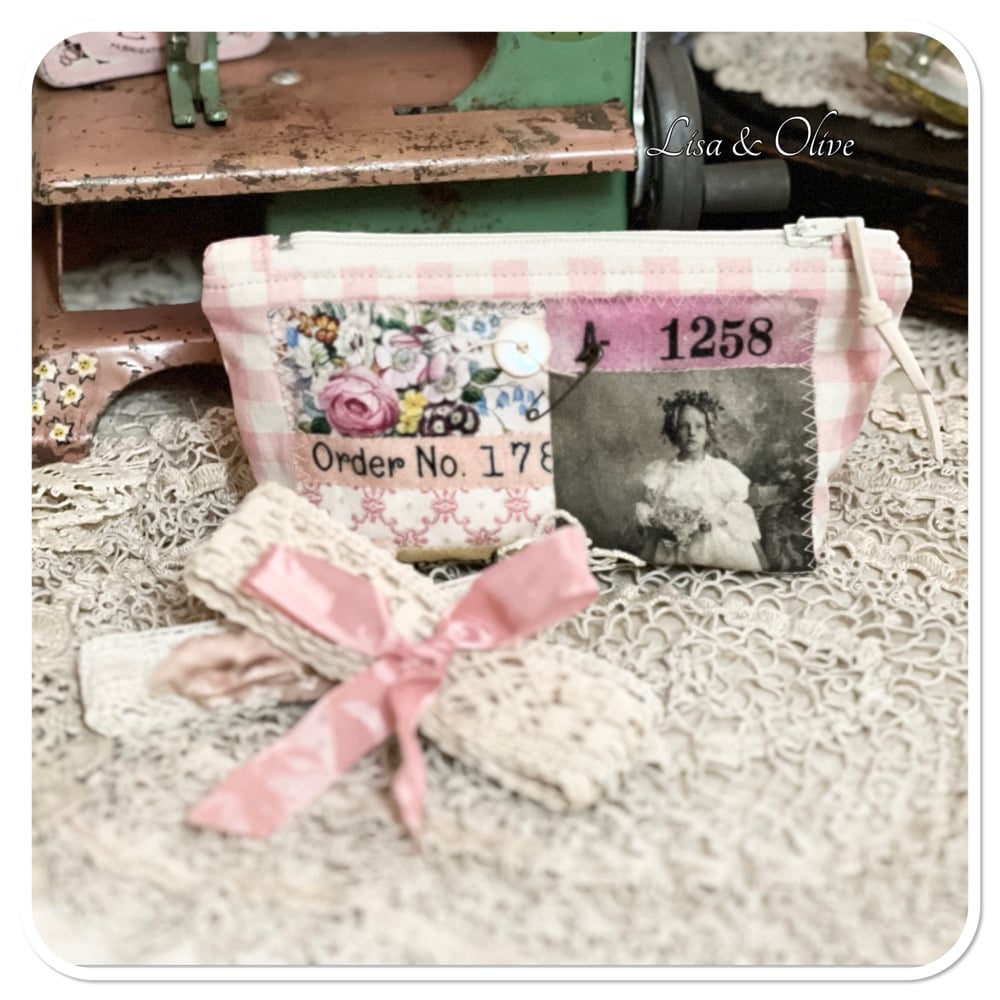 on the back of the purse is a handbag pin badge with vintage French ephemera